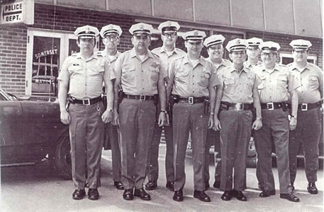 This photograph of Somerset Police officers was taken in front of their new office at 340 West Union Street, probably in 1971 or 1972. At the time, officers wore light gray shirts, medium gray trousers, and white 8-point cap.