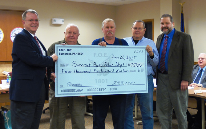 The Fraternal Order of Eagles, Aerie 1801, recently presented the Somerset Borough Police Department with a gift of $4,500.00 toward the purchase of video cameras for use by the department’s officers during the normal course of their duties. Pictured in the photo are (l-r), Chief Randy Cox, Eagles representatives Carl Rose, John Berkey and Stephen Shaulis, and Mayor Scott Walker. The check was presented at the January meeting of Somerset Borough Council.